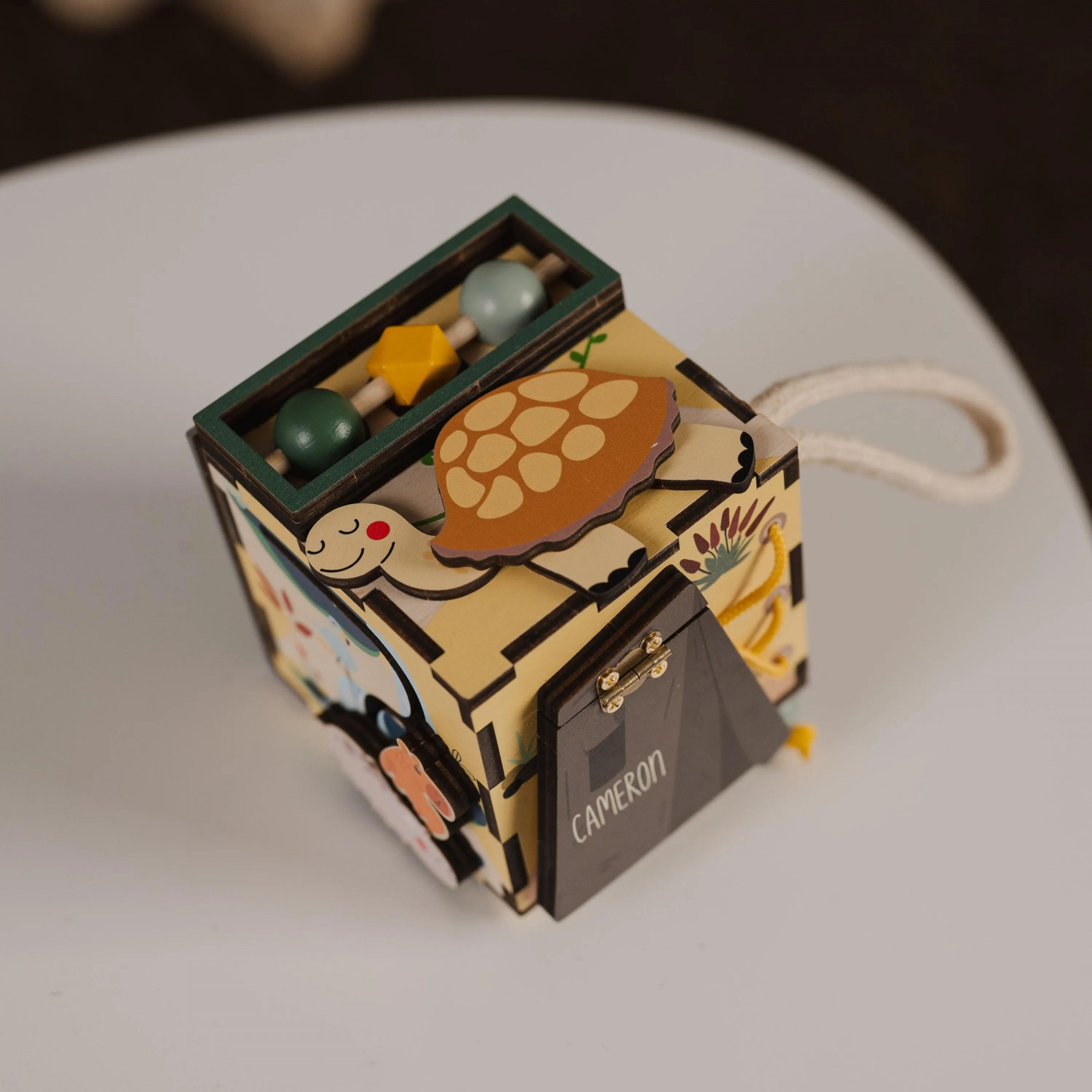 Measuring just 8 cm (3.1 in) x 8 cm (3.1 in), this interactive cube features six activity-packed sides, each offering unique challenges to keep tiny hands engaged and curious minds exploring!
