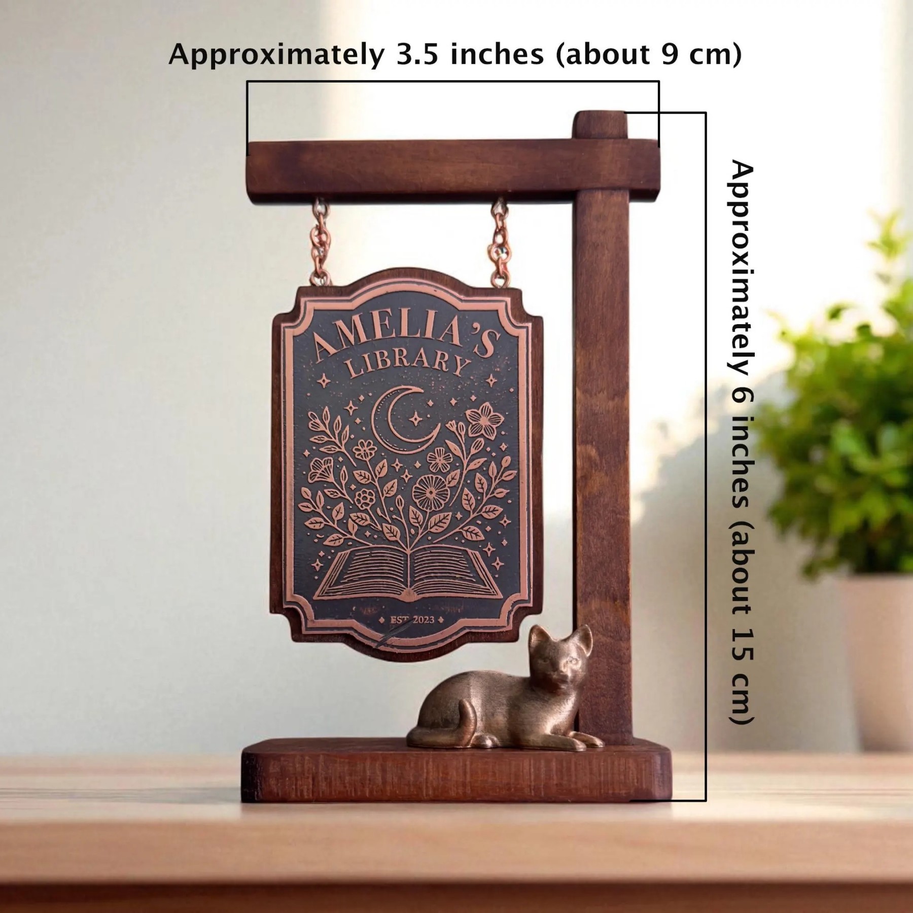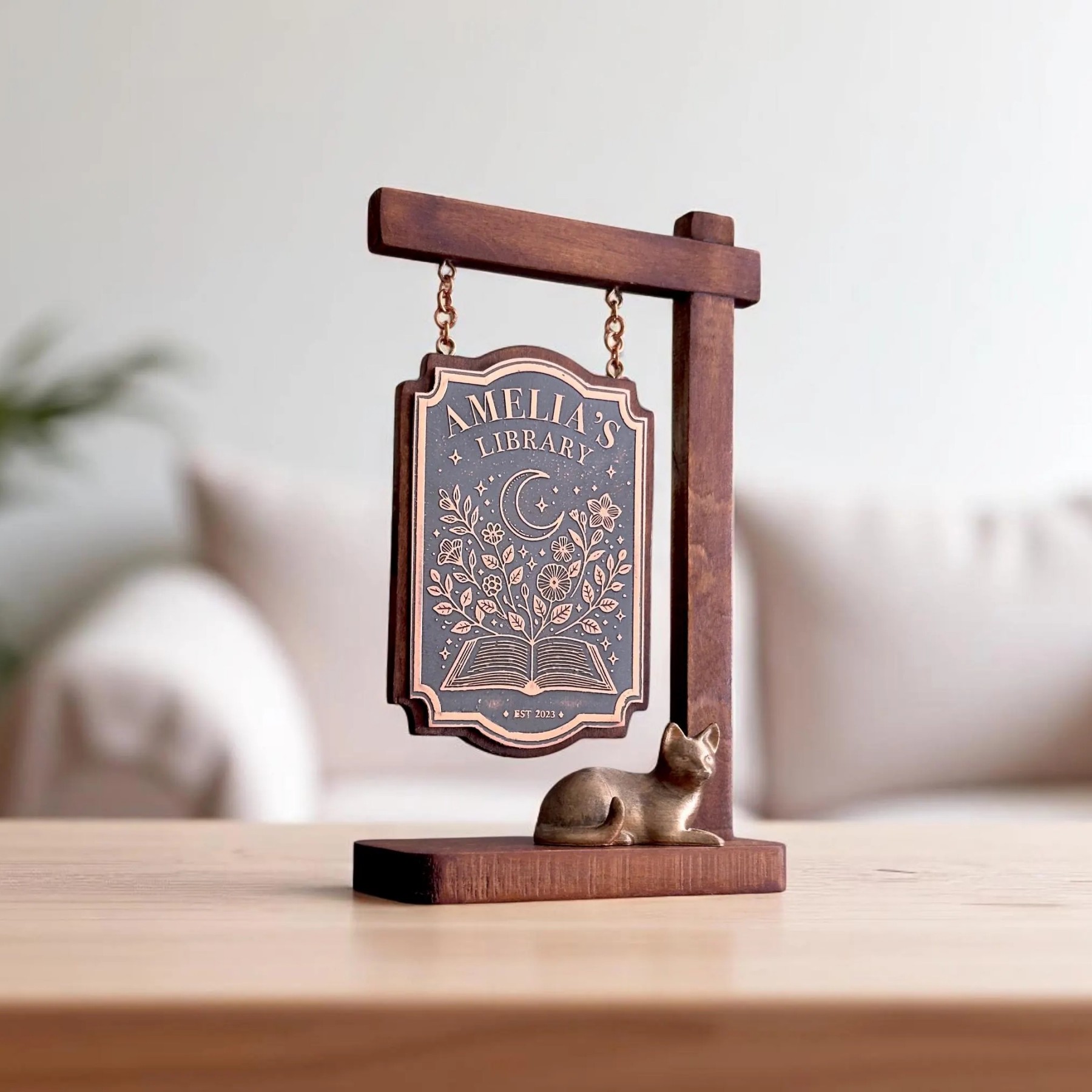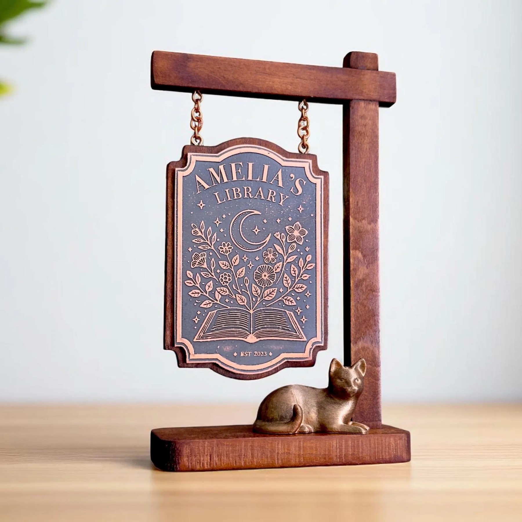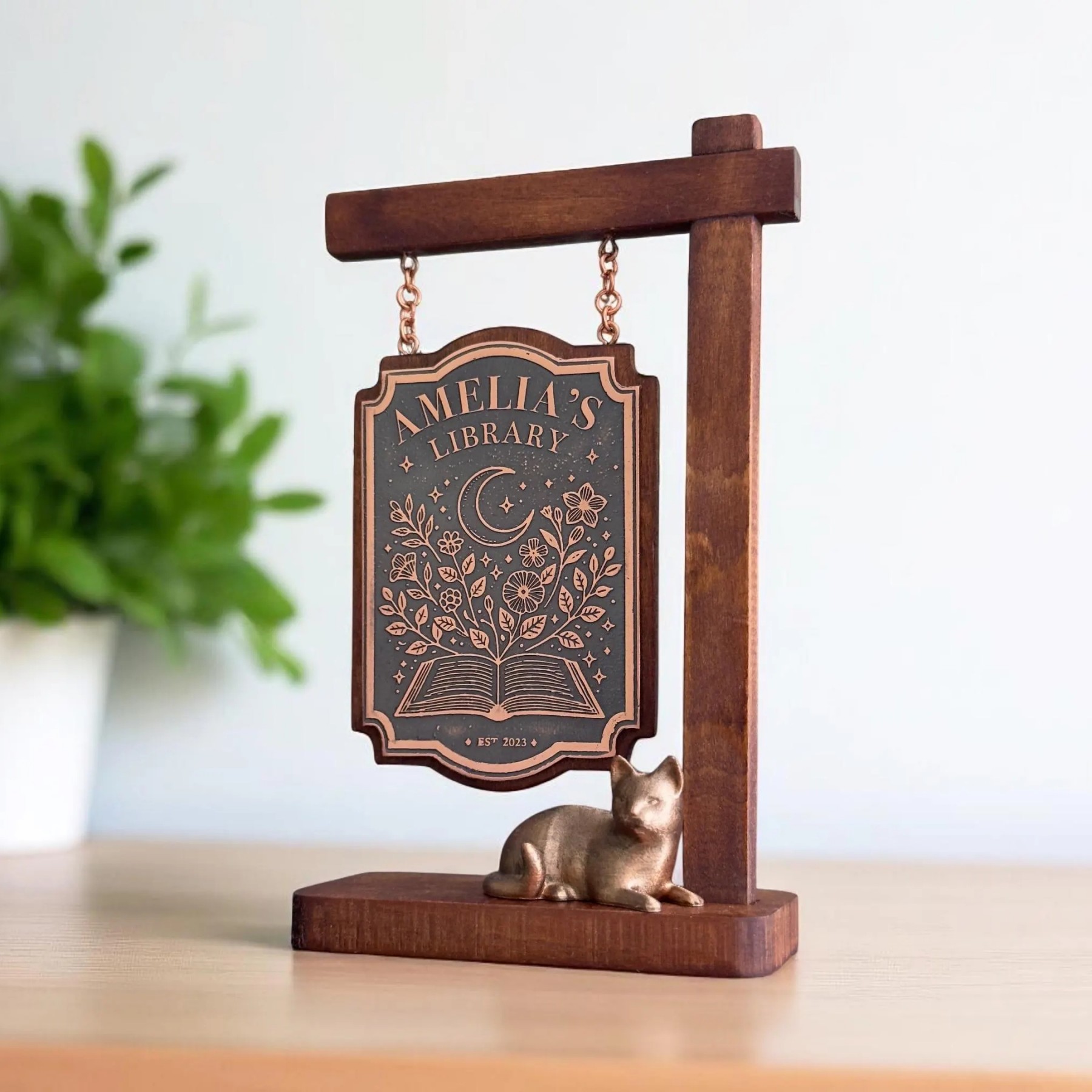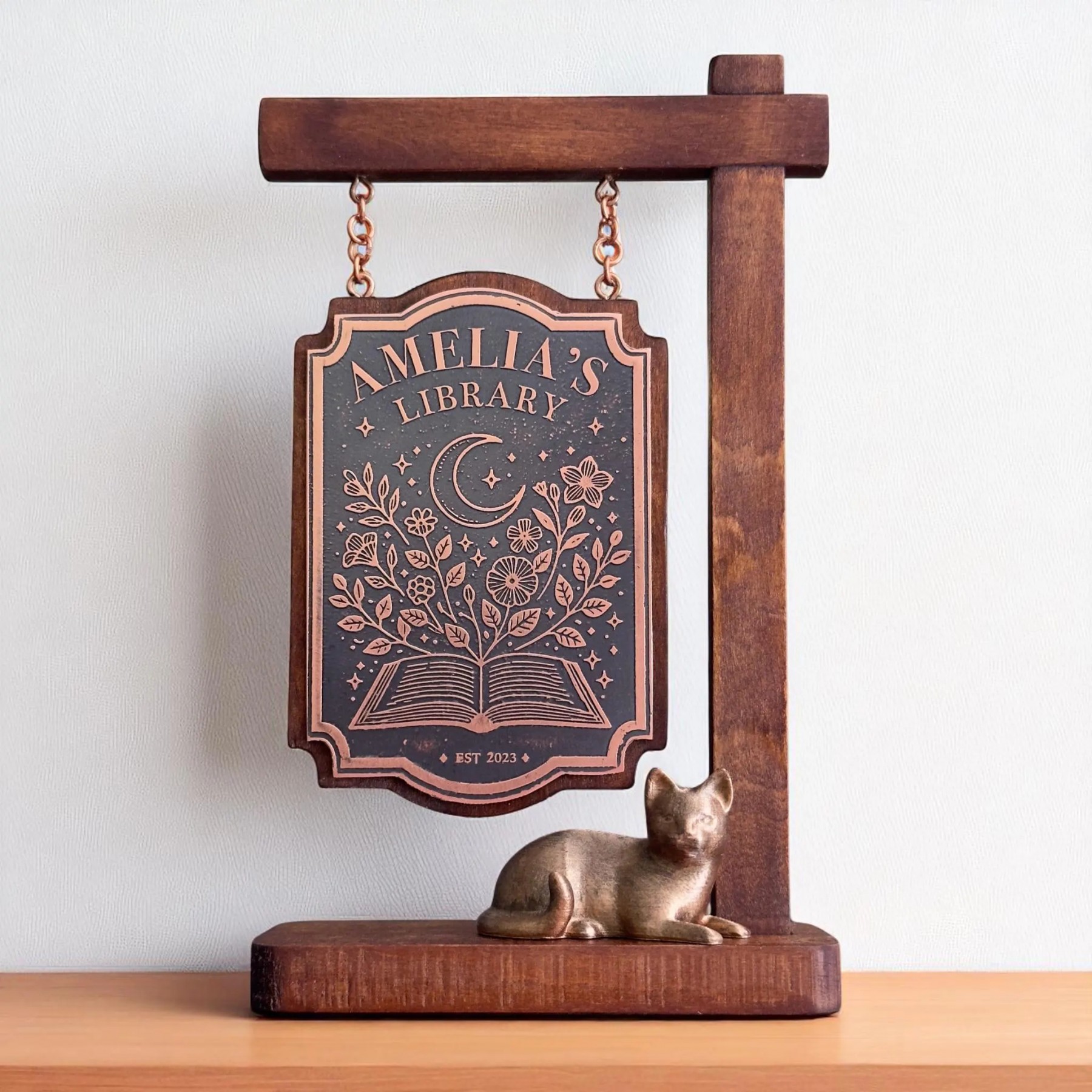 This special sign transforms your library into a warm, personal space that reflects your unique style and welcomes every guest. Carefully handcrafted, it carries a one-of-a-kind character, with its patinated copper and wooden base adding timeless charm.