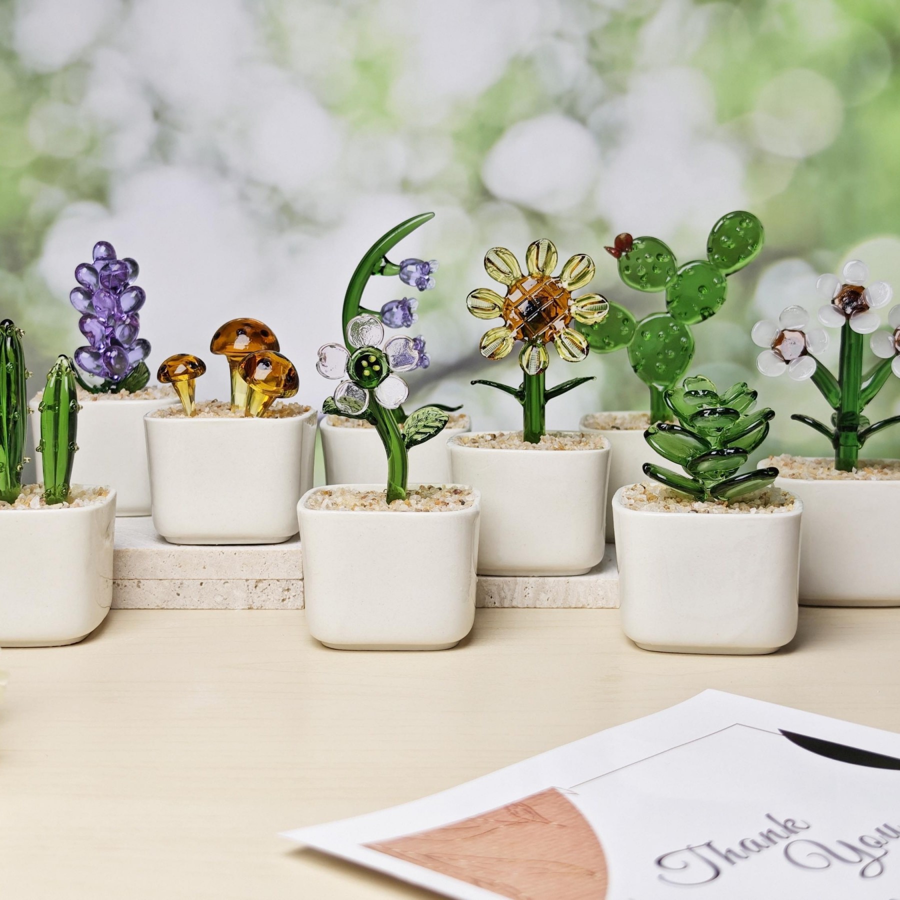 Elevate your space with our exquisite handcrafted glass potted plants, available in 9 stunning designs. Each elegant piece now comes with fully customizable text on its chic ceramic pot — making it truly your own.
