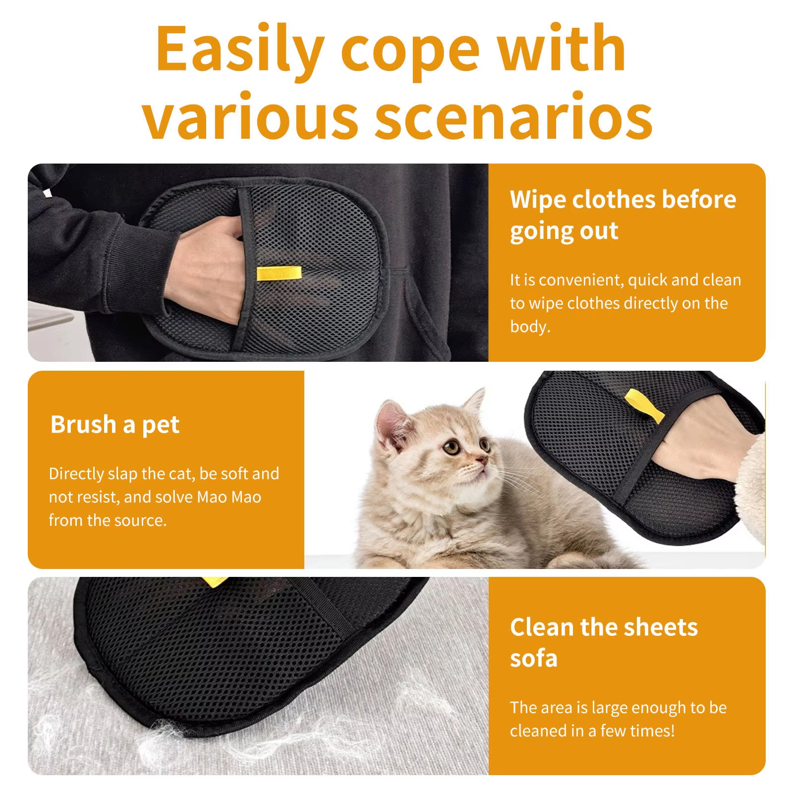 Pet hair is everywhere—on clothes, furniture, beds, and your beloved pet itself. This portable electrostatic pet hair removal glove is designed to tackle pet hair quickly, gently, and efficiently, wherever it appears.