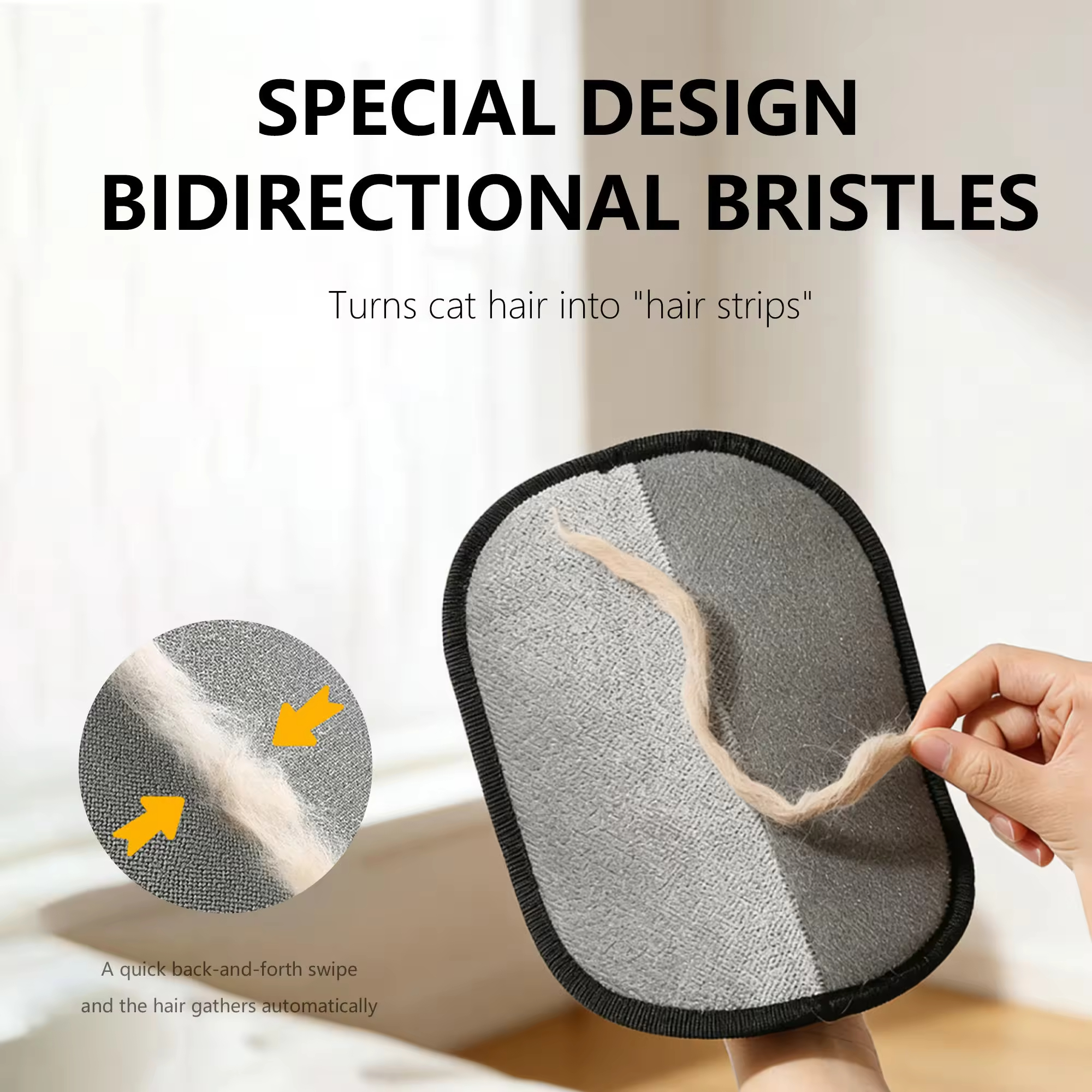 Equipped with dual-sided bristles, this glove increases surface contact and improves hair collection efficiency. Simply wipe, brush, or glide over surfaces to gather pet hair quickly and easily.